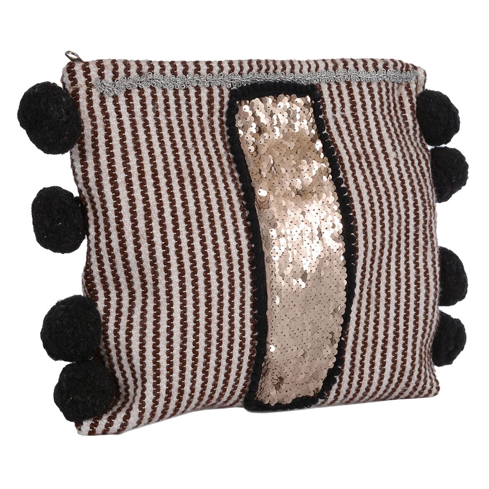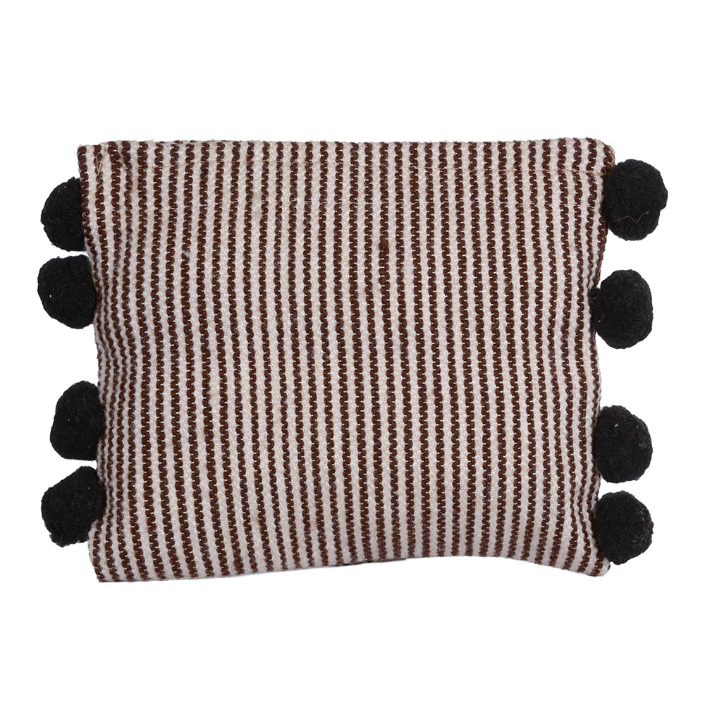 Φάκελος σε παραδοσιακό αργαλειό με μάλλινες κλωστές καφέ και μπεζ με μεγάλα πον- πον στα πλάγια και πιέτες στο κέντρο, χωρίς χερούλι ! Διαστασεις:30cm πλάτος 26cm ύψος!